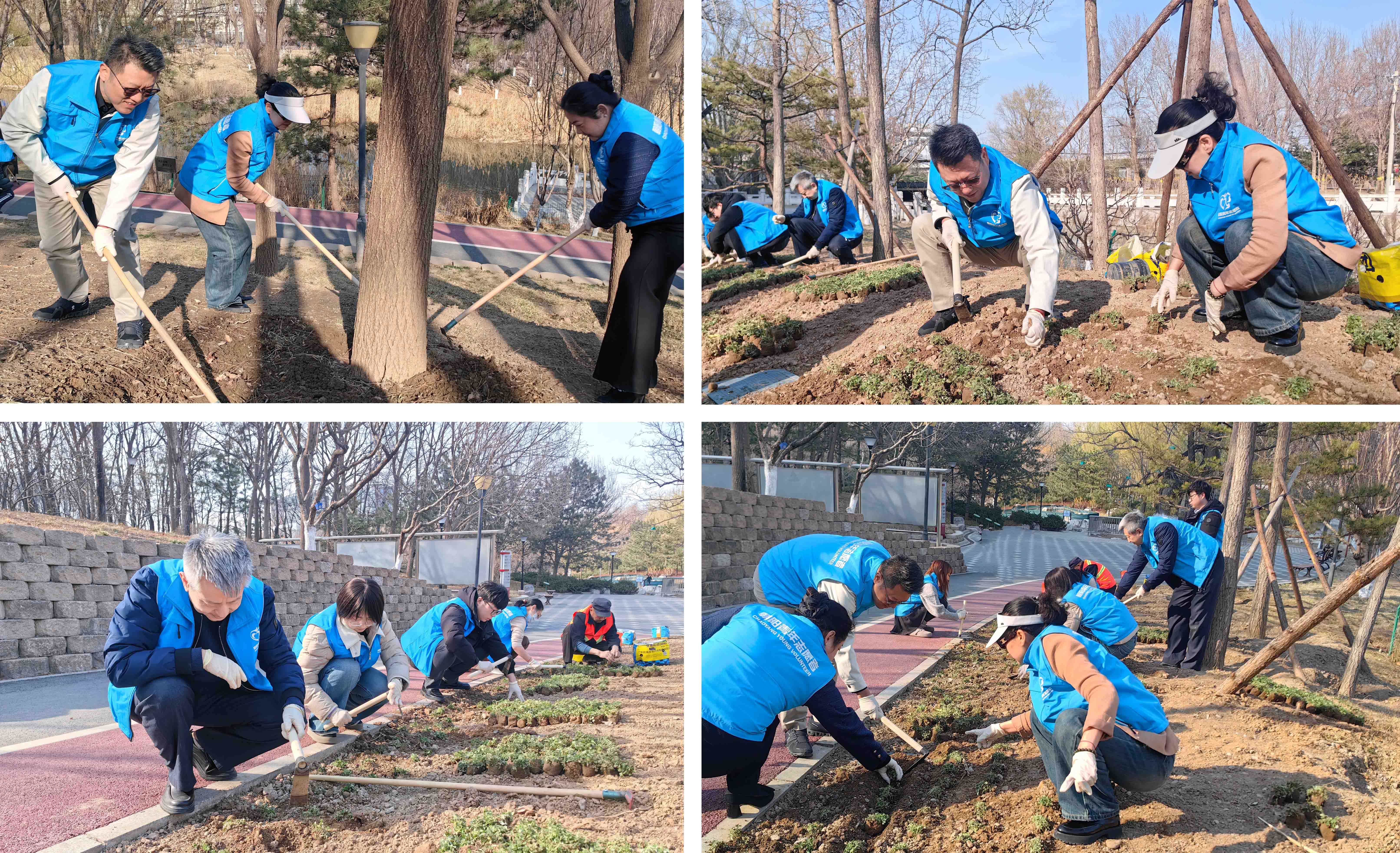 活动当日,大望京公园草木初盛,现场氛围热烈而有序。志愿者们身着统一的志愿服装,手持铁锹、水桶等工具,分组奔赴指定区域,在公园技术人员的指导下进行抚育种植劳动。每一个环节都严谨规范、有条不紊。部分志愿者还主动承担起周边杂草清理、枯枝修剪以及中耕工作,耐心呵护每一株树苗扎根生长。阳光下,铲土声、协作声与欢笑声交织,笔直的树苗错落挺立,迎着春风舒展枝芽,为公园注入蓬勃生机,形成了一道鲜活的“蓝色风景线”。