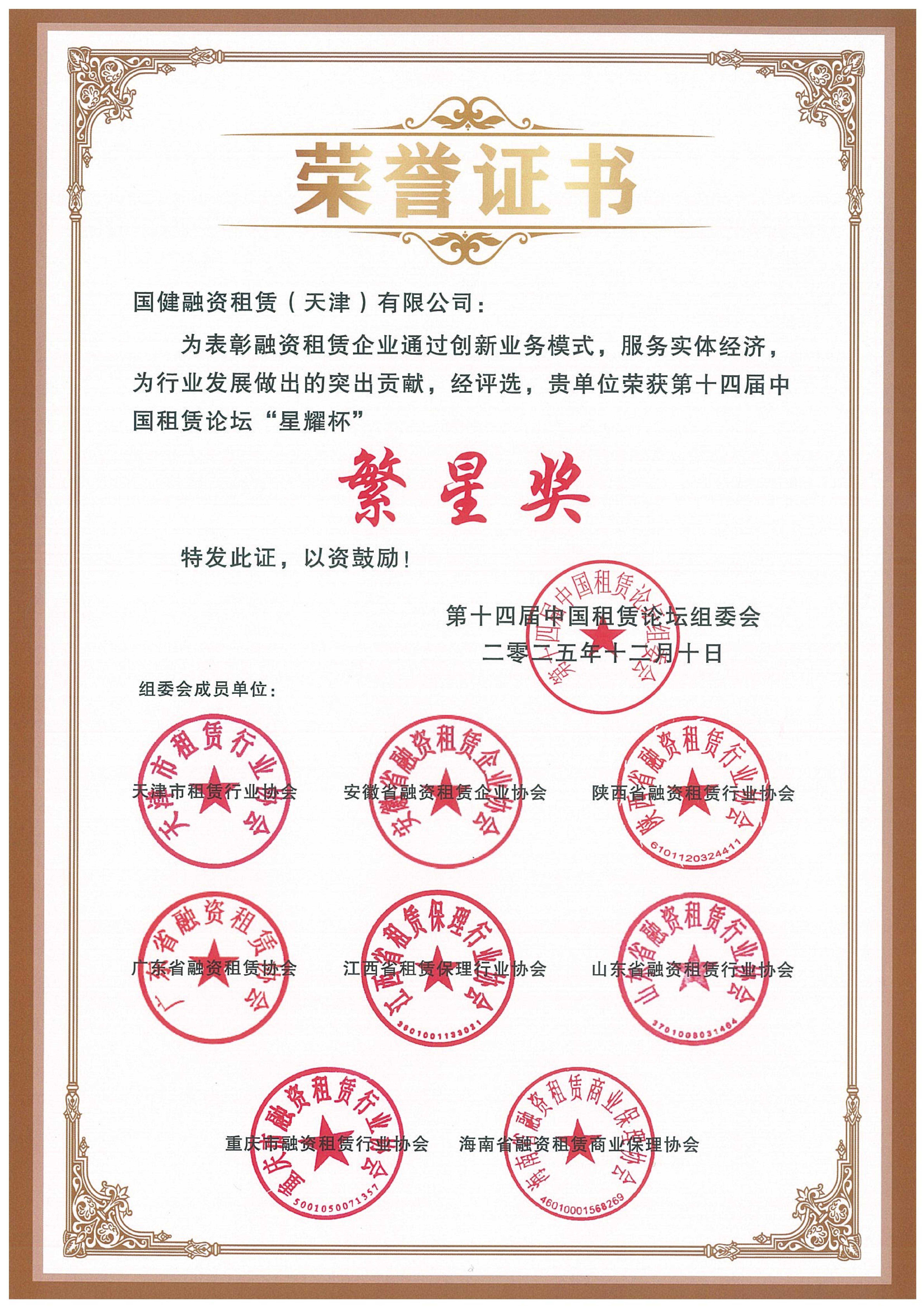近日,第十四届中国租赁论坛“星耀杯”年度企业评奖结果正式揭晓。本次评选由多个省市租赁行业协会联合开展,旨在表彰2025年度业绩突出、表现卓越的租赁企业及团队,推动融资租赁行业高质量发展与企业间交流合作。国健融资租赁(天津)有限公司(以下简称“国健租赁天津子公司”)凭借合规稳健经营及服务实体经济的显著贡献荣获“年度繁星奖”。